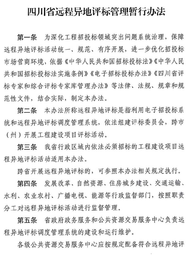 四川省发改委和四川省公共资源交易中心共同印发《四川省远程异地评标管理暂行办法》,自2022年7月1日起施行,有效期两年。