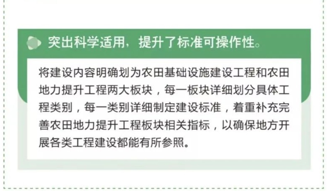 《通则》具有统筹设施建设与地力提升、突出科学适用性、提升标准可操作性的鲜明特征。在修订设施建设指标的同时,着重补充完善了地力提升相关指标,按建设内容详细划分具体工程类别,每一类别详细制定建设标准,既确保地方开展各类工程建设都能有所参照,也为各地开展耕地质量提升建设提供有效技术参考。